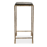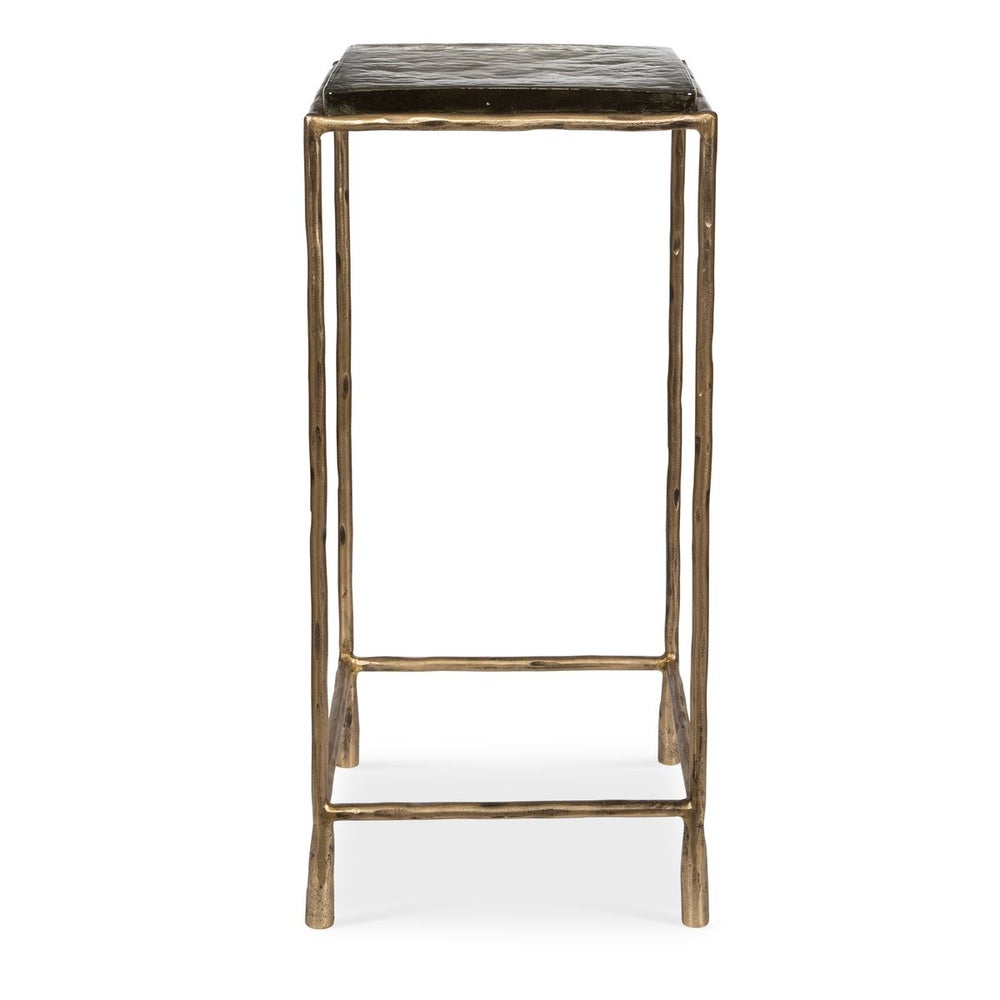 Sculptural and sleek, the Ovard Accent Table combines a hammered brass-finished iron frame with a thick cast glass top for a striking balance of texture and tone. Its slender silhouette makes it perfect for small spaces, adding a refined touch with a hint of organic character.