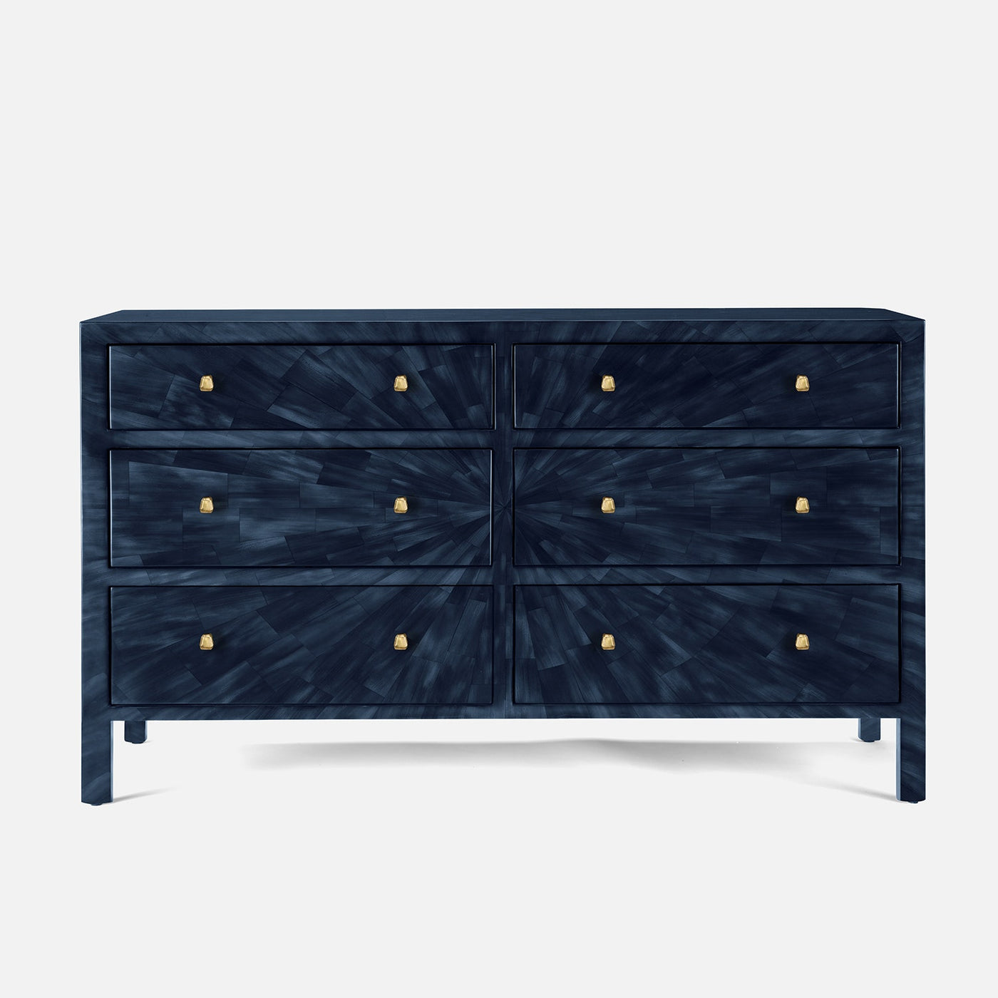 Introducing the exquisite Phoenix collection featuring nightstands and dressers. This piece showcases a mesmerizing faux horn material adorned with an intricate pattern radiating from a striking central focal point in the most wonderful navy color.