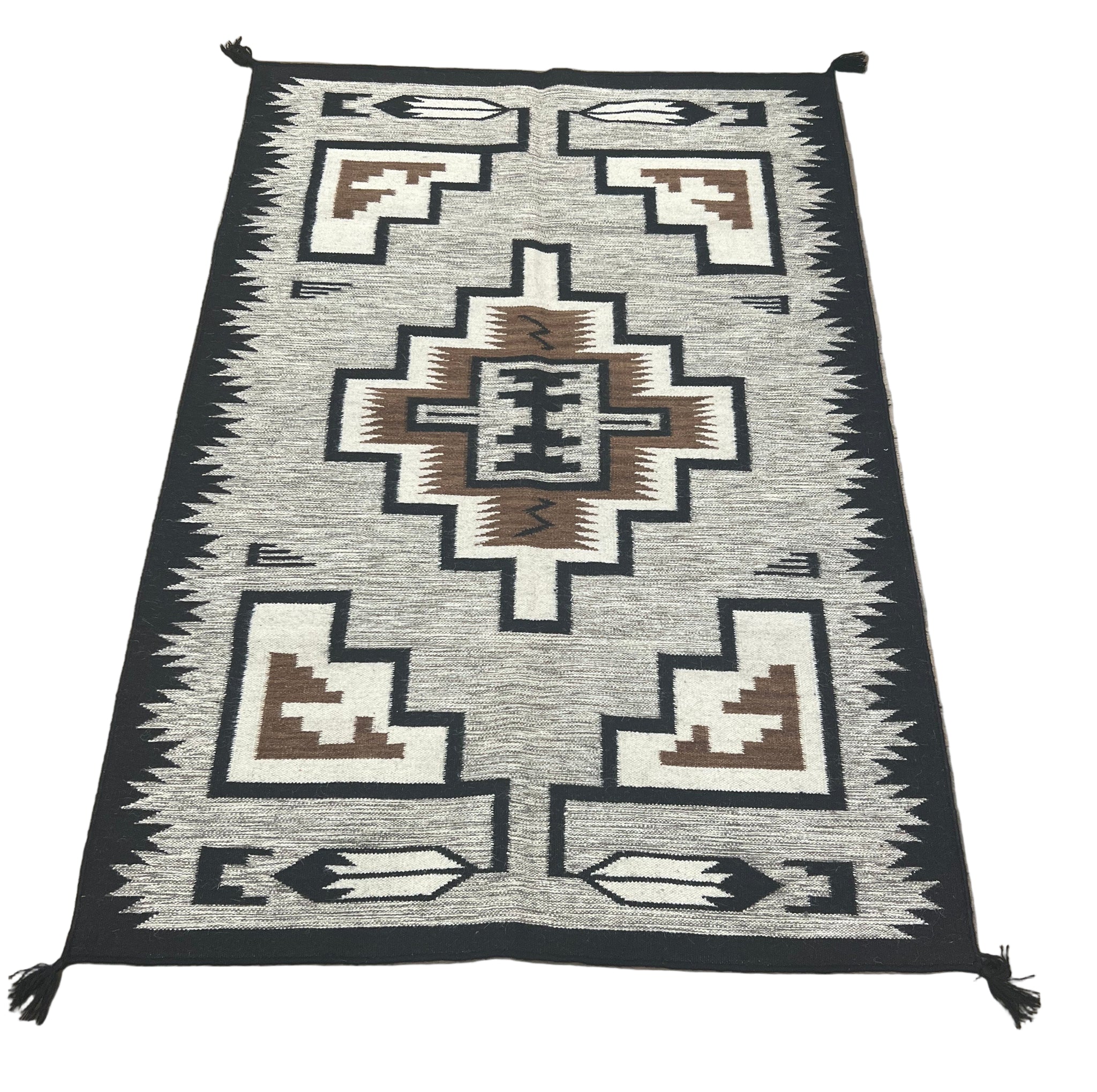 A beautiful geometric traditional Tribal Wool Berber Flat Weave Rug in Heathered Grey, Brown, White and Black colorway.