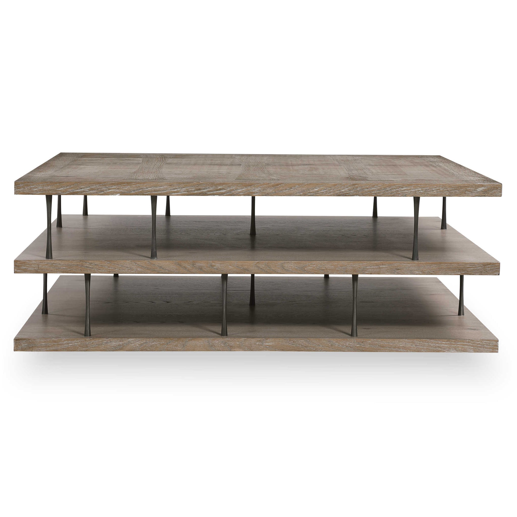 Striking in both form and function, the Cavalcade Coffee Table offers a bold architectural statement for modern living spaces. Featuring three stacked wood shelves in a light, weathered finish, this table provides generous storage and display space. Slim, sculptural metal supports add an industrial edge while giving the table an airy, tiered look. Perfect for showcasing books, decor, or simply keeping essentials within reach, the Cavalcade blends clean lines with warm texture to complement a wide range of interiors.