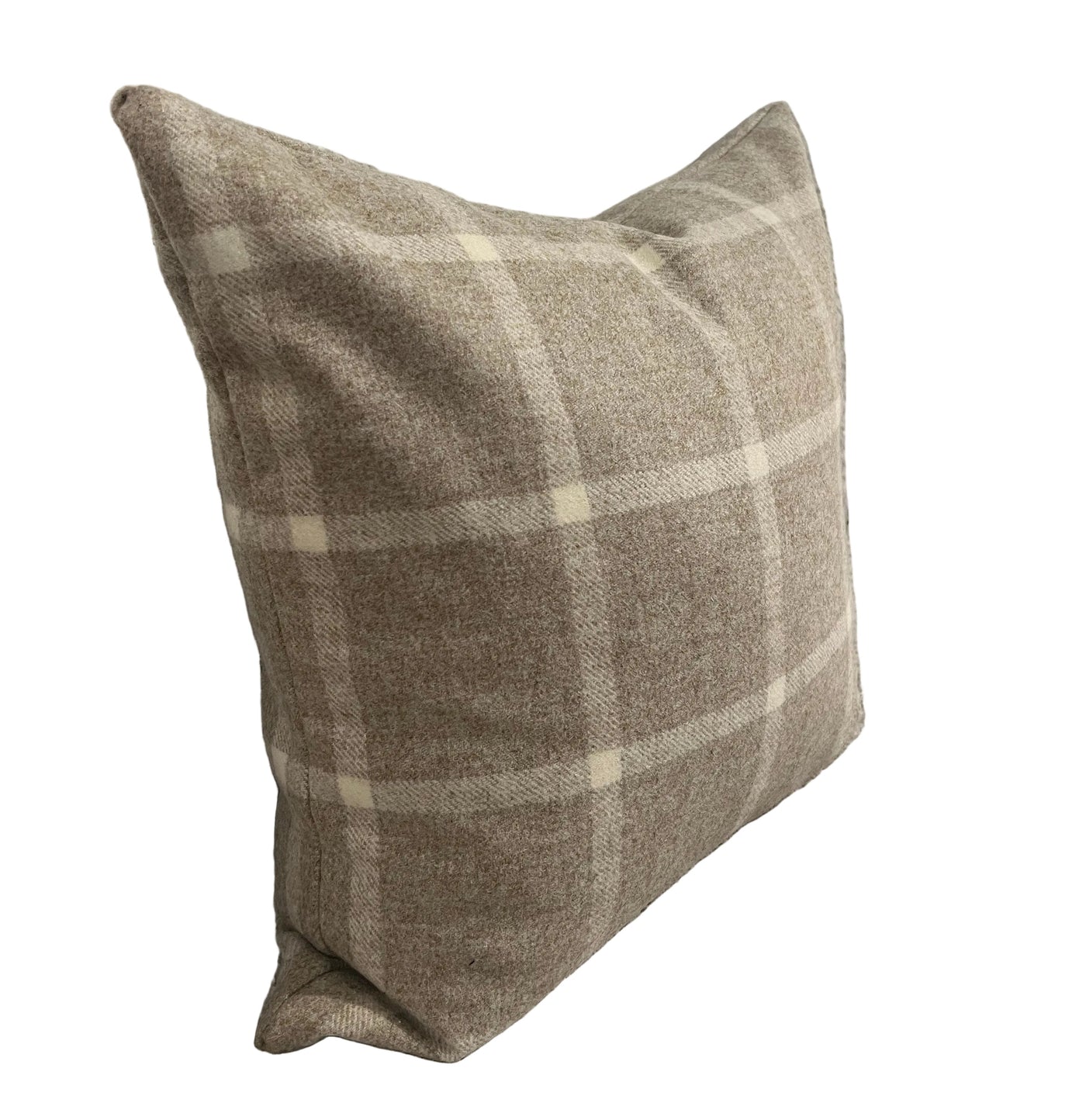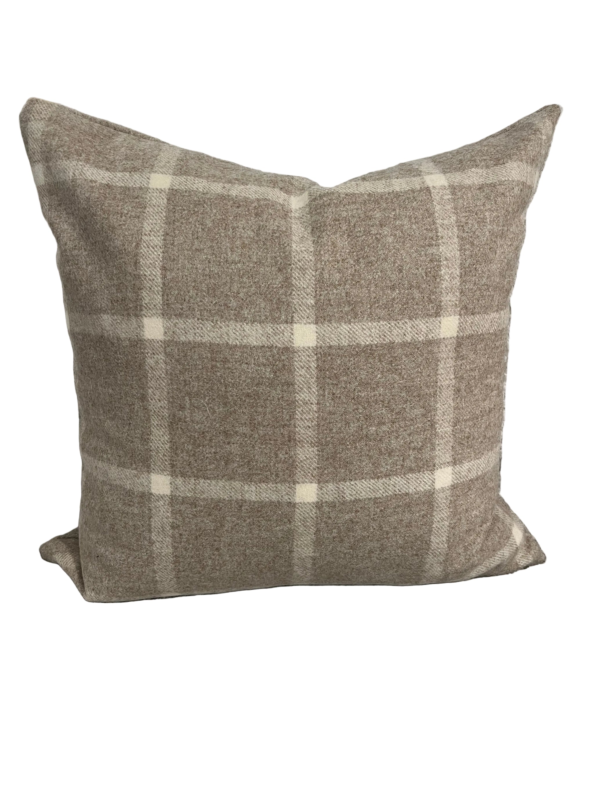 This chic, custom Natural 100% wool throw pillow is the perfect neutral plaid for any modern mountain home. Down feather insert.