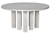 A White-Washed round dining table features a thick plank top and symmetrical columnar box legs. The sculptural base contrasts with the light wood grain, making it a bold centerpiece for modern and minimalist interiors.