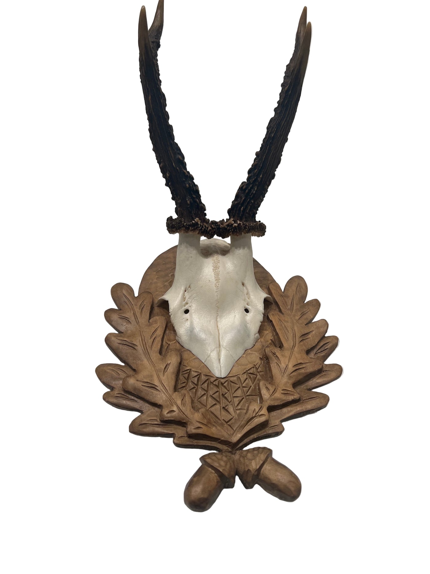 Beautiful, Vintage German Antler Deer Mount on carved pale oak with oak leaf and acorn motif.