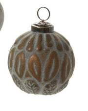 Elevate your holiday decor with the Dogwood Ornament Collection. Featuring a modern twist on classic shapes, this collection includes both a glass sphere and teardrop-shaped ornament with dimensional details and a bronzy dark gold finish. Perfect for hanging on a tree or garland, or as a standout piece in a holiday bowl, these ornaments add a sophisticated touch to any festive arrangement. Green round patina'd ornament