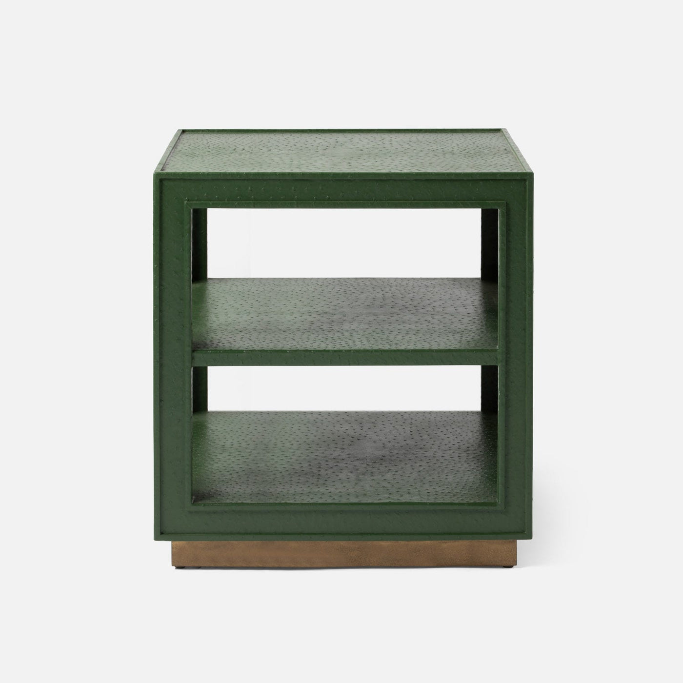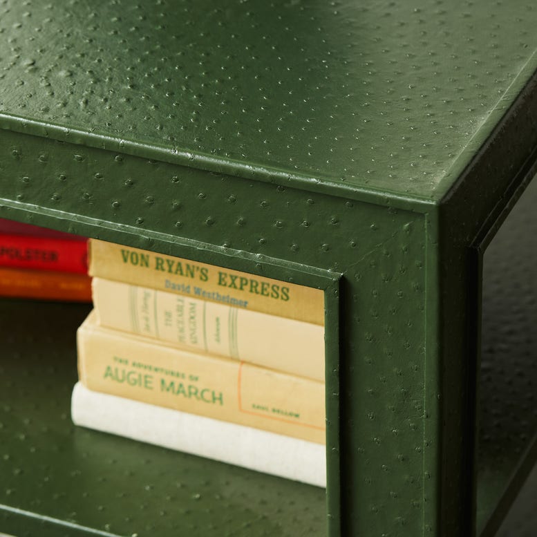 The rich texture of faux ostrich elevates the clean lines of this side table. The crisp geometry of its architecture is emphasized by a frame edged in slender molding and the addition of a shelf.