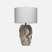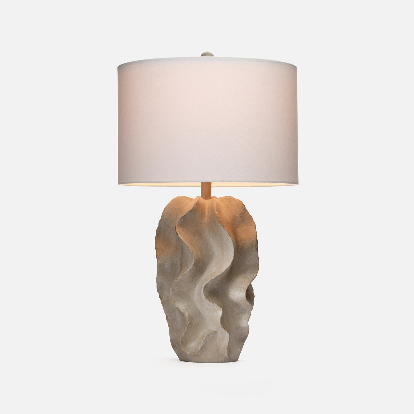 Undulating curves of mold-cast textured white resin soften the shape of a traditional urn lamp base topped with a linen shade.
