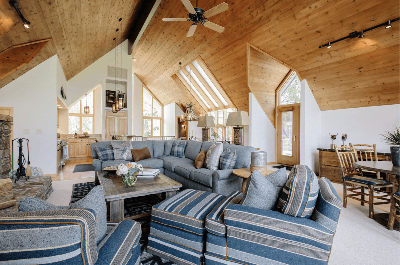 Mountain Maple reinterprets the rustic lodge aesthetic through a fresh, modern lens. The architectural envelope provides volume and light, while the interiors embrace contrast—crisp cabinetry alongside textured stone, bold lines softened with tactile accents. Designed for a family that values both style and comfort, the space features layered seating areas, personalized bedrooms, and a kitchen meant to be lived in. The overall feeling is one of approachable luxury—elegant, grounded, and full of life.