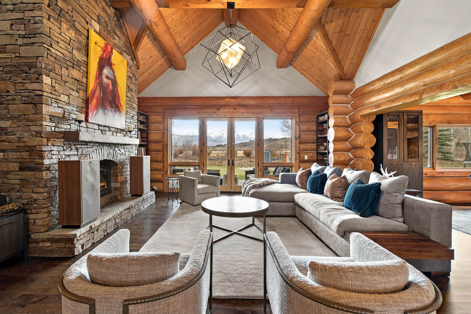 This serene residence takes its inspiration from the iconic Sleeping Indian mountain peak, with a design that elevates simple materials through form and finish. A calm, tonal palette anchors each space while expansive glass doors blur the line between indoor and out. Custom lighting and subtle art placements introduce warmth and depth, bringing personality to otherwise minimal spaces. Designed as a tongue and groove traditional western log home, this project showcases modern elements that blend effortlessly with classic Jackson style. The residence feels equally suited for gathering and quiet reflection.