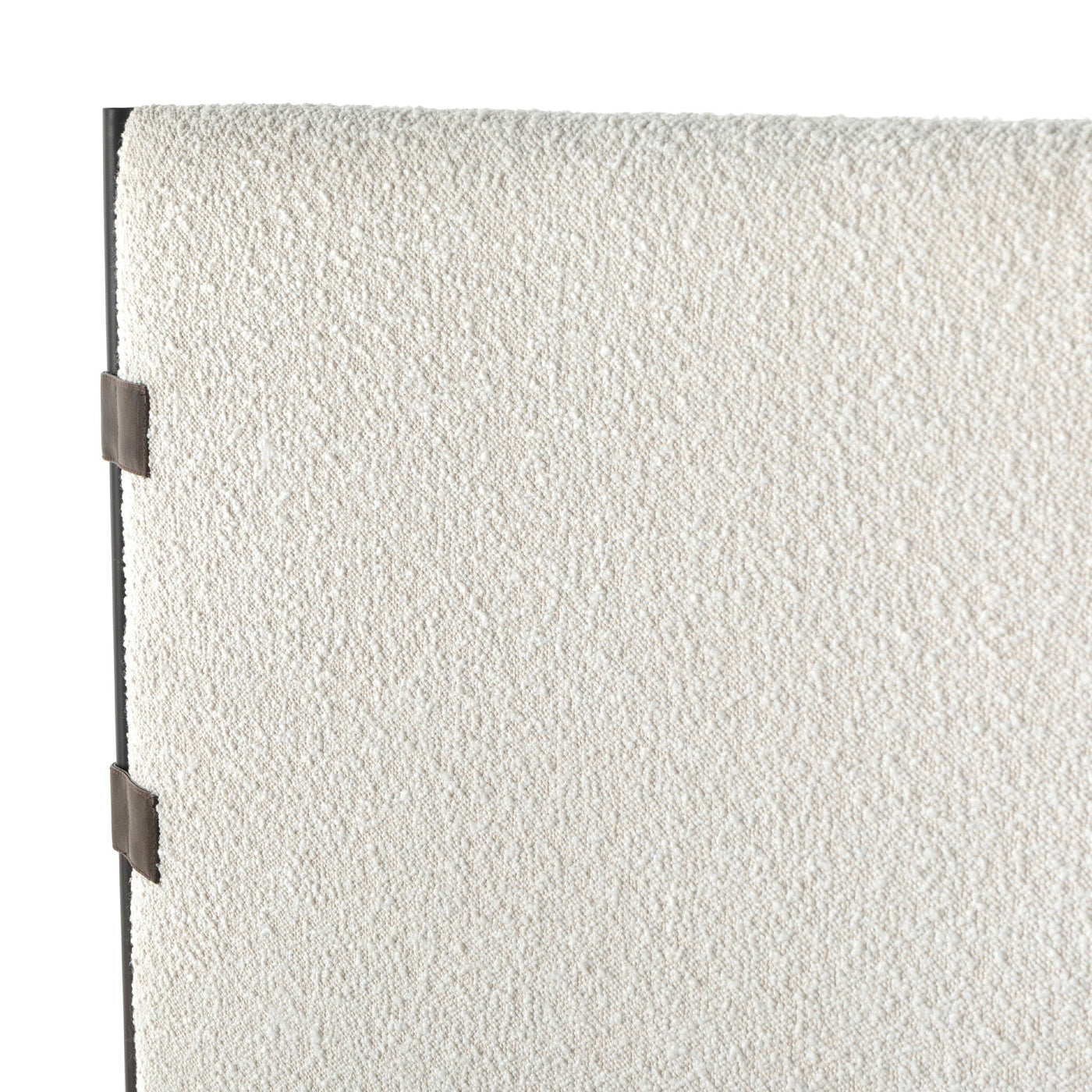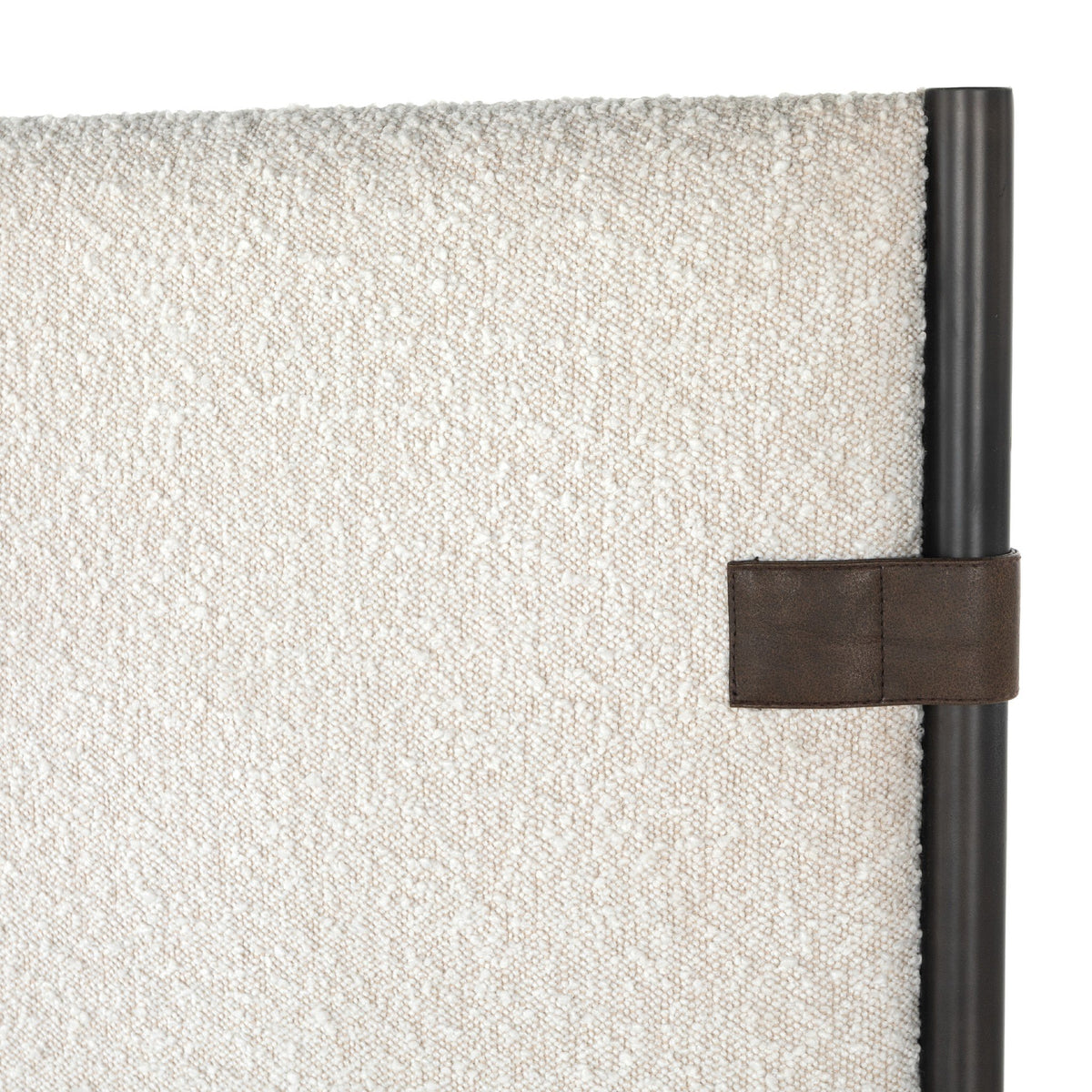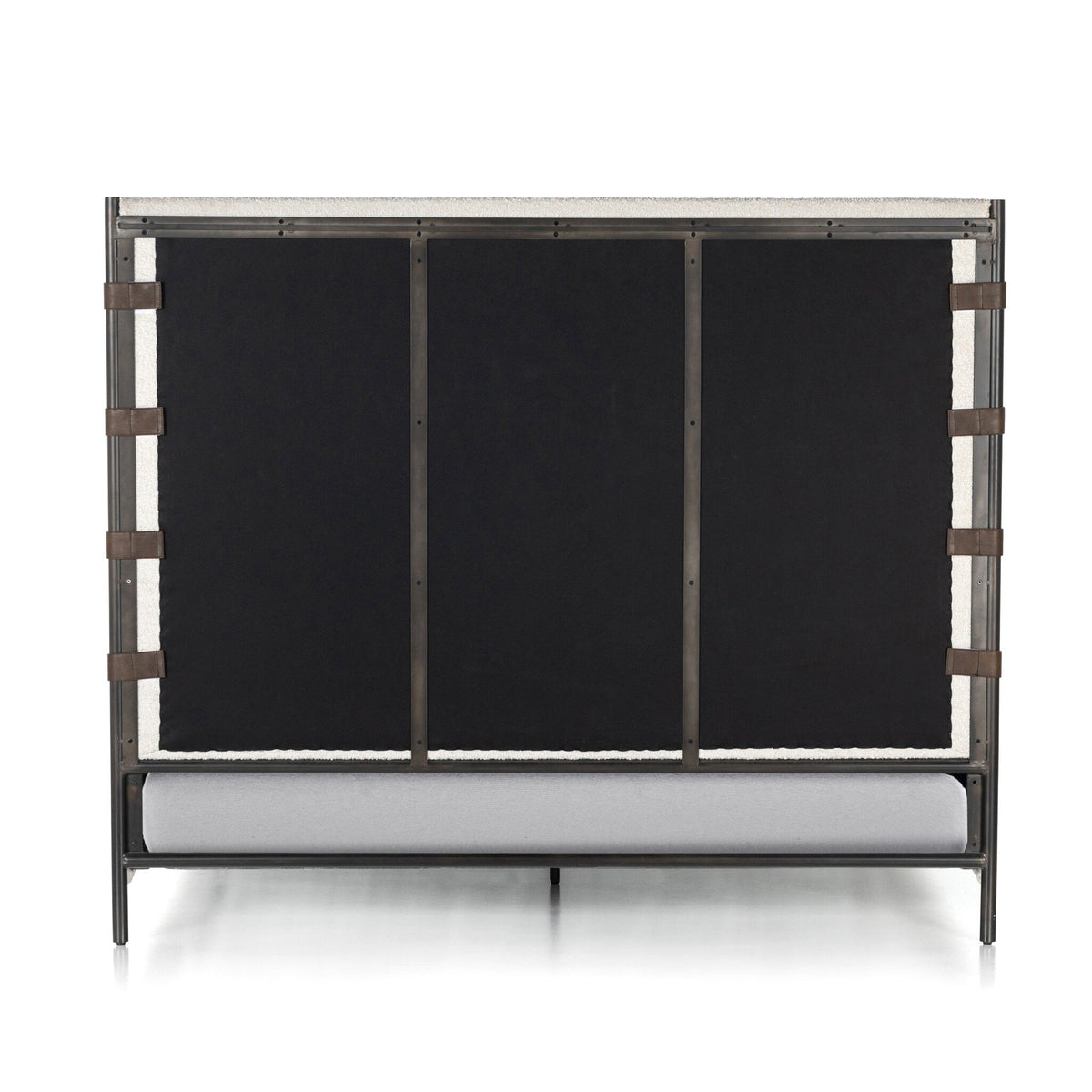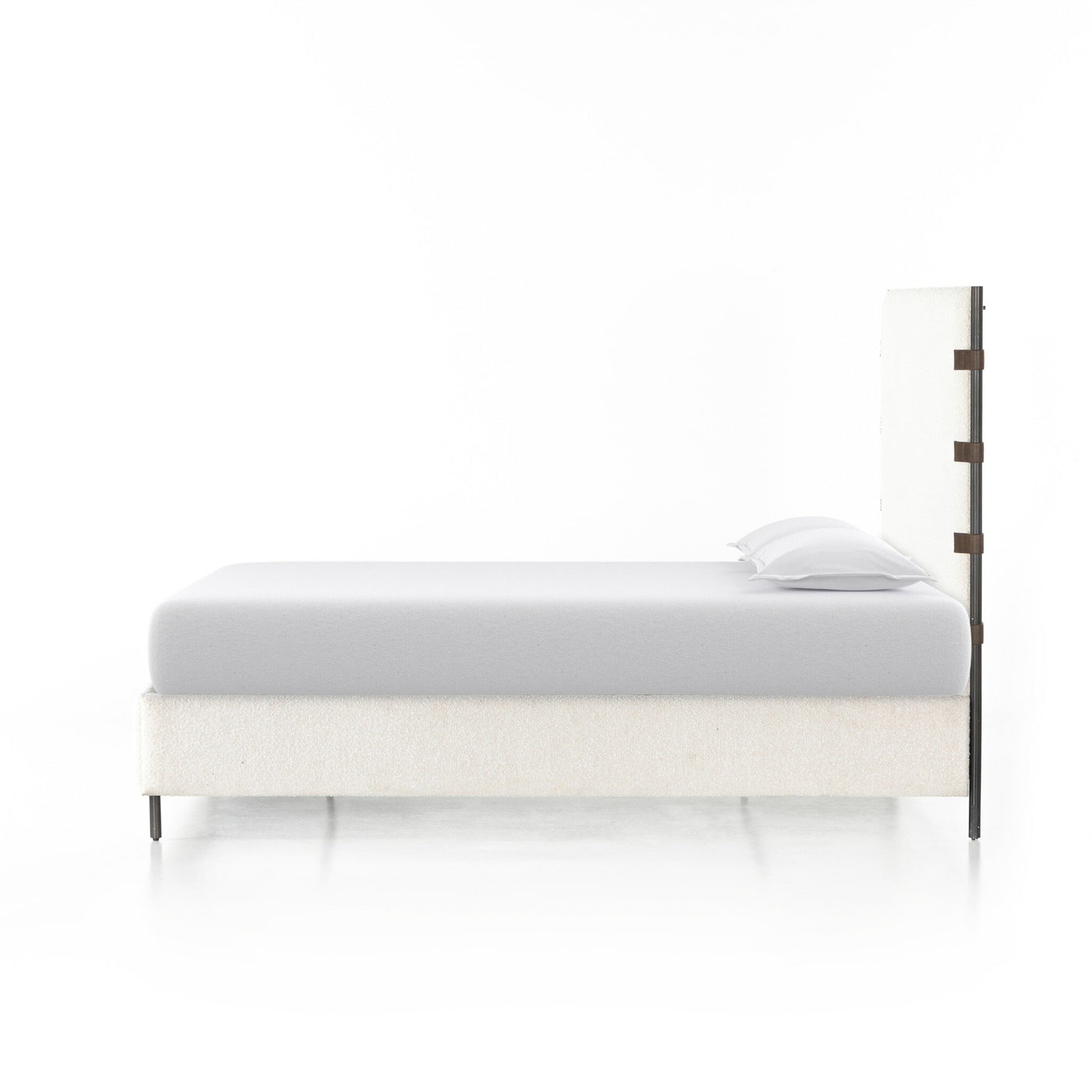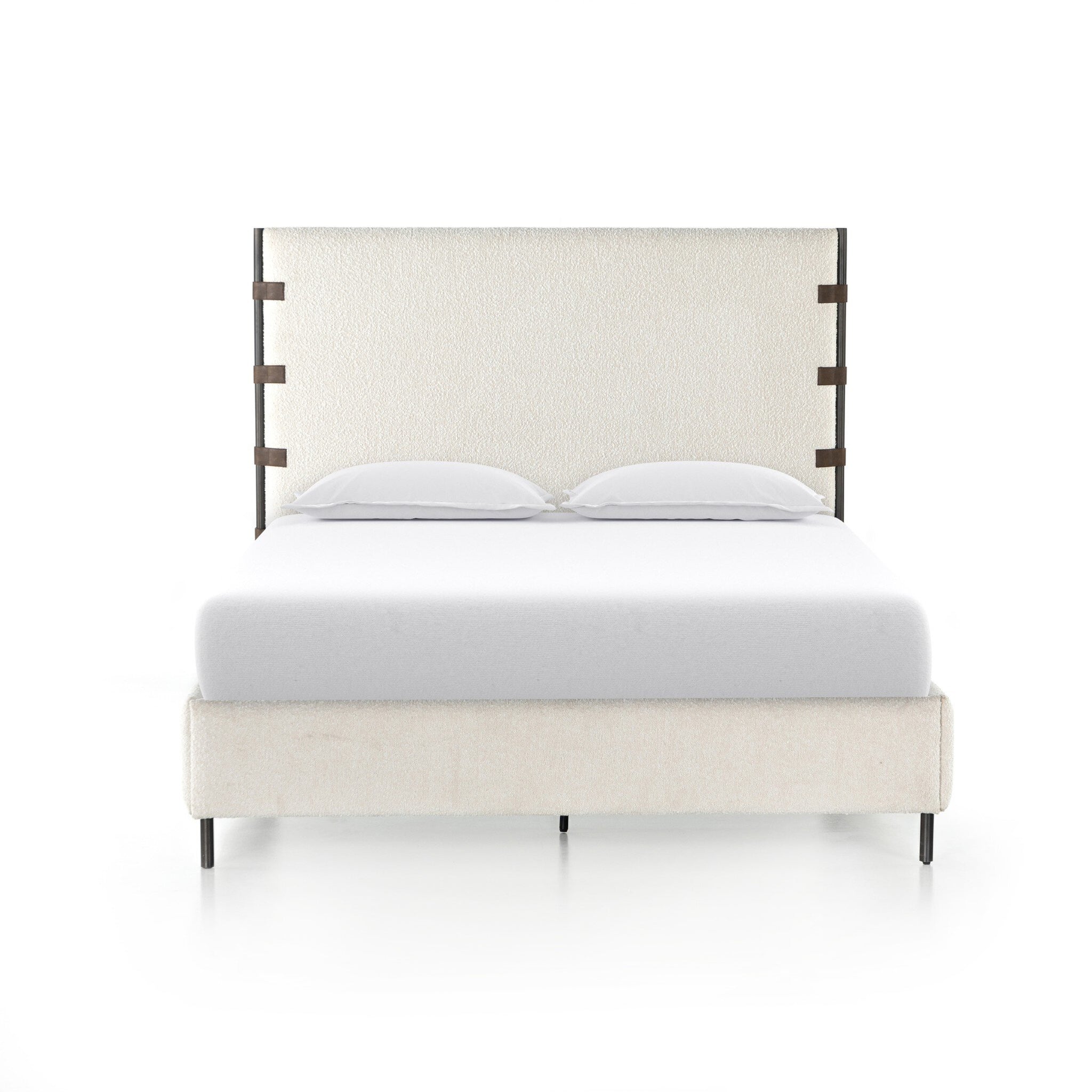 The Anderson King Bed is where refined comfort meets elevated design. Its tall, upholstered headboard is wrapped in a plush, ivory-toned fabric that brings a soft and welcoming feel to the room. Accented with rich leather strap details and framed in dark, slender metal, this bed delivers a sophisticated contrast of texture and tone. The clean lines and minimalist silhouette make it a perfect statement piece for modern, transitional, or even rustic-inspired bedrooms. Designed for both style and support, the Anderson King Bed transforms your sleeping space into a serene, stylish retreat.