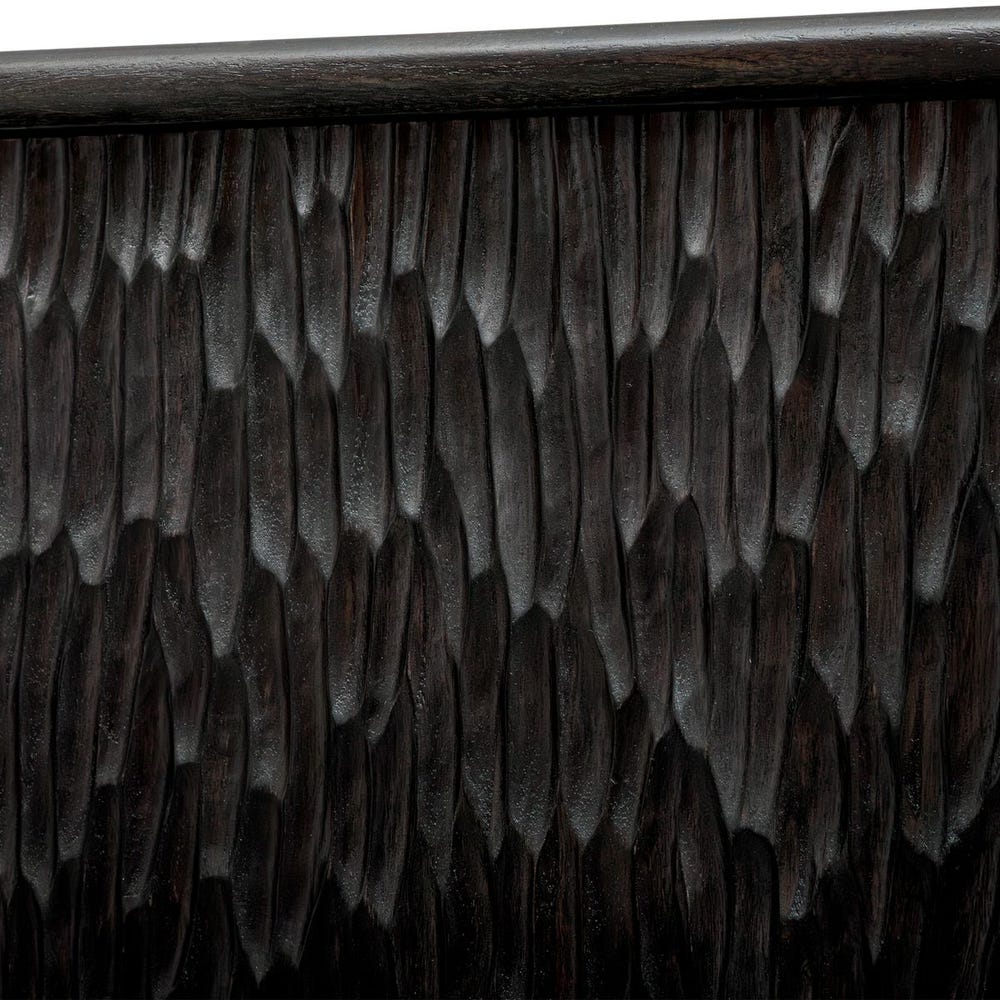 This four-door cabinet is expertly crafted from Mindi wood and finished in a rich multi-toned ebony color. The solid wood doors are carved with a chiseled texture, adding depth and creating a striking visual contrast that enhances the overall design and depth of the cabinet.