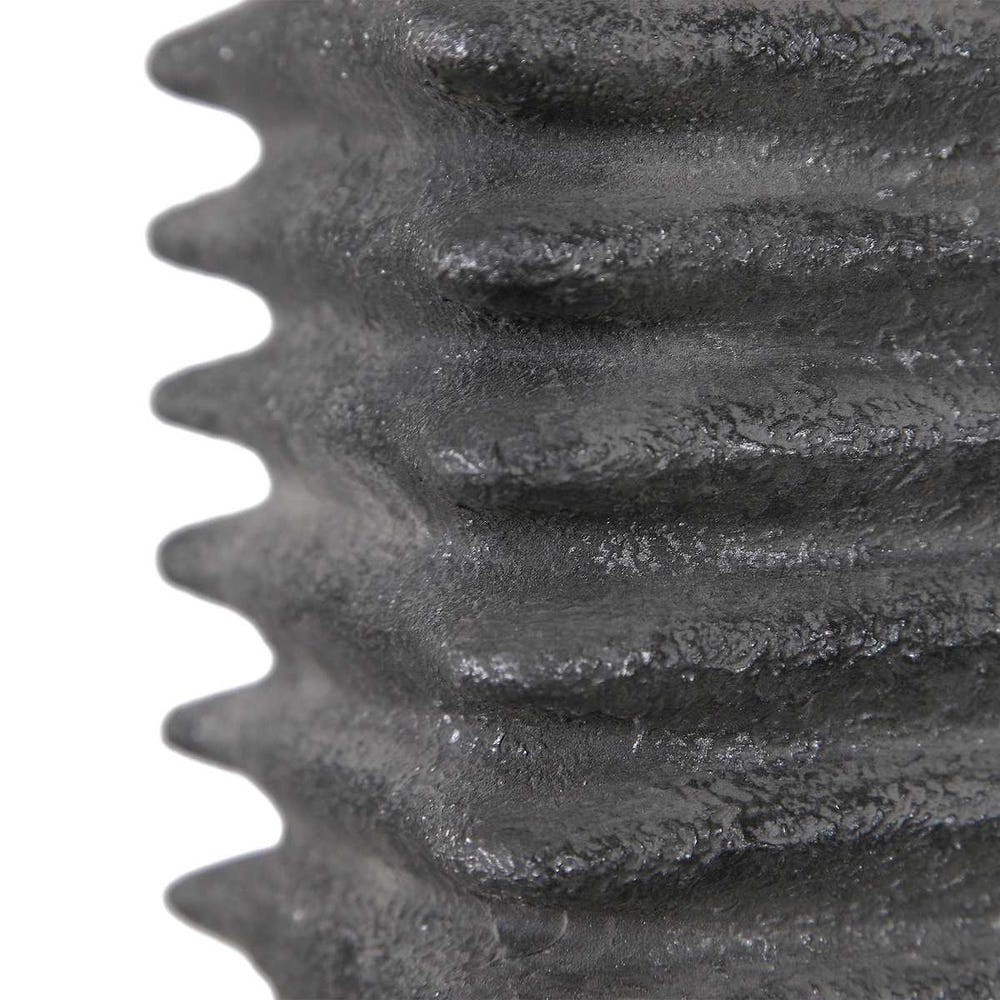 This ceramic table lamp features a deep ribbed texture with a subtle organic shape finished in a metallic charcoal glaze, accented with matching metal details. The rectangle hardback shade is a white linen fabric.