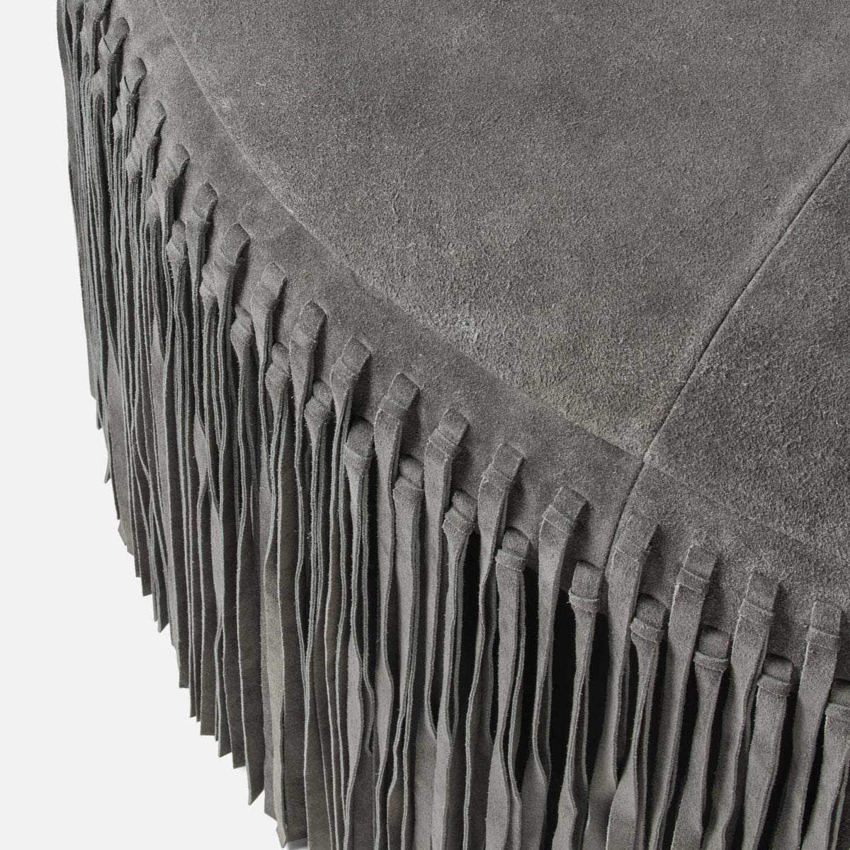 Laid-back boho style gets an elegant makeover in our Hallie, a round coffee table covered from top to bottom in soft suede. Dressed up in trim that's cut to perfectly graze the floor.