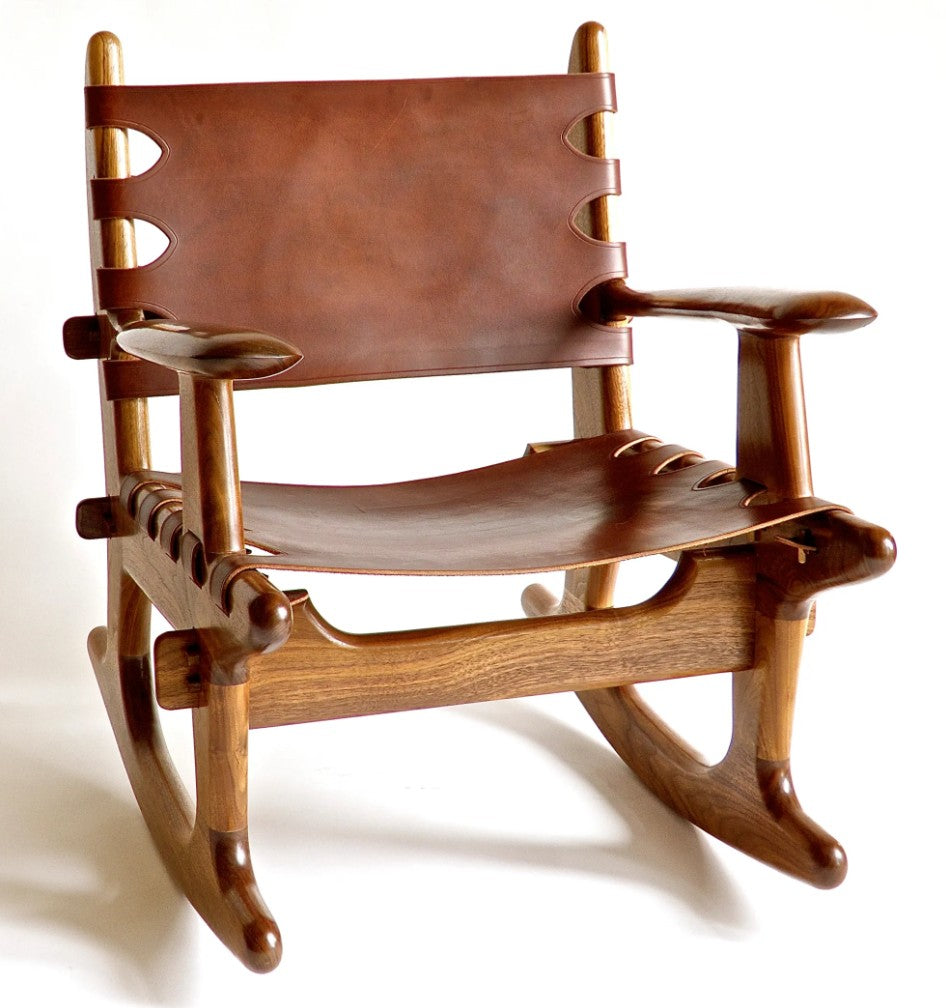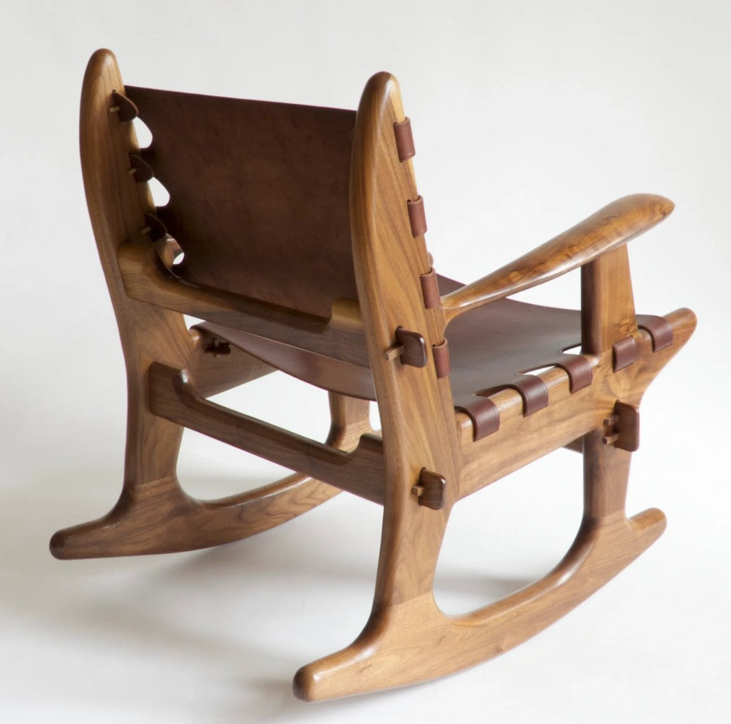 The Cowboy Rocker is a very unique rocking chair that gets better with time, the leather will stretch just a little to fit your body perfectly. This luxury handmade chair has no nails or screws in the construction of this amazing chair and the unique design allows everybody to have their feet touch the ground allowing it to fit a wide range of people. This is not a chair that you can get from a large furniture manufacturer, these are one-of-a-kind hand made to last for generations and become a family heirloom. Handmade in Montana. Leather and wood customizable.