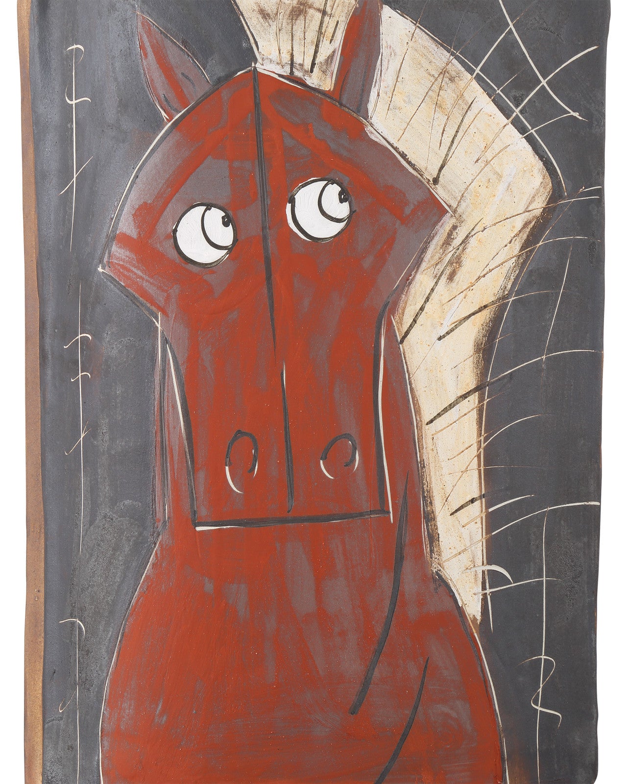 With a whimsical motif that could have been drawn by a child or by Picasso, the Artistic Horse Medium Vase is made of porcelain in a mix of red, black, and off-white hues. The irregular shape of the vase, which resembles a pinched oval, and the fact the top is not hollow but has a smaller opening than expected are surprises of the design of this black vase.