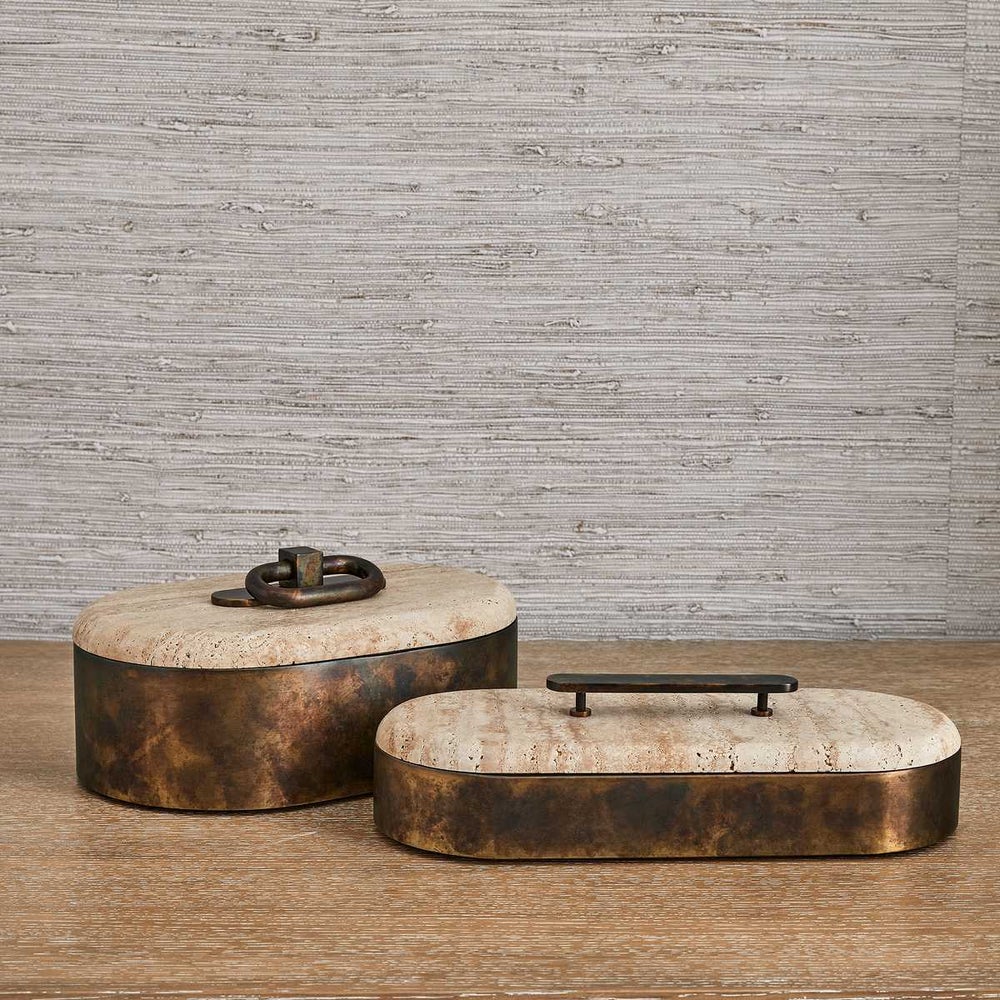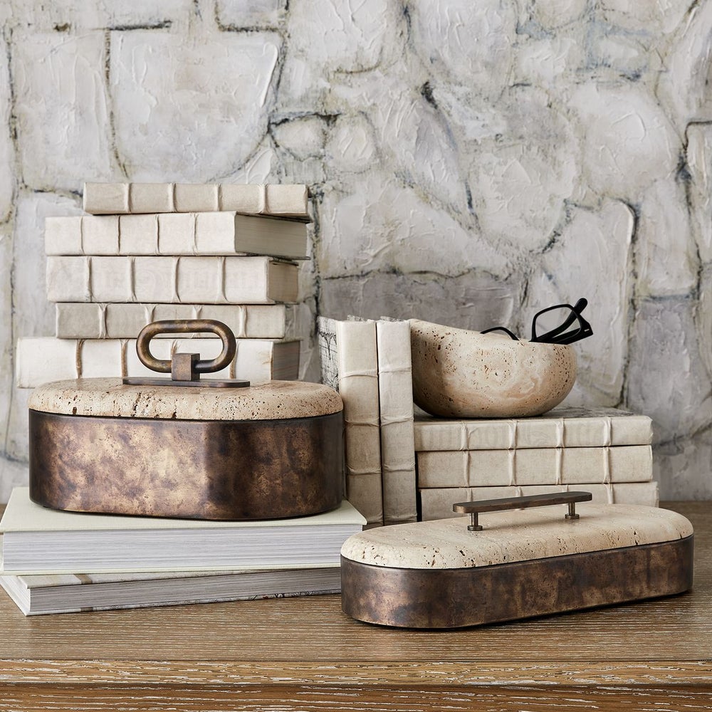 The Hippodrome Box is a beautiful oblong metal container made of steel with a highly distressed acid brass finish. The curved organic unfilled beige travertine top with honed finish has soft curved edges and a large racetrack shape handle finished to match the base. The interior has black velveteen lining. A beautiful addition to any tabletop or shelf.