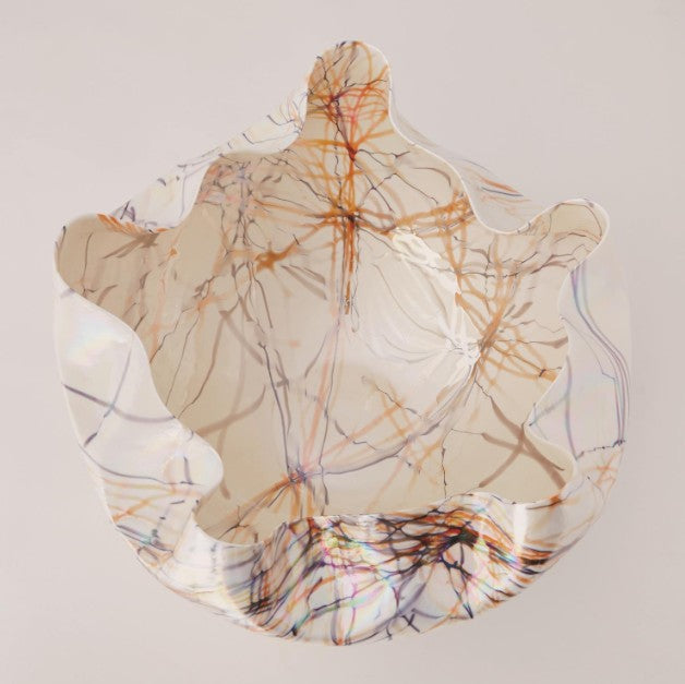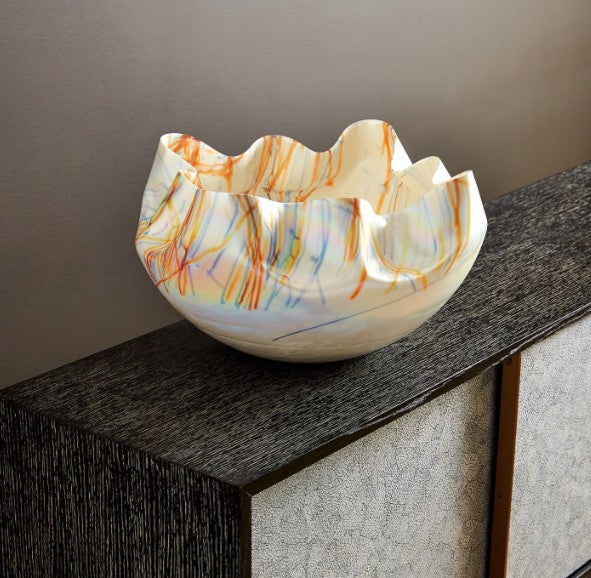 Italian artisans in Murano create each bowl as an individual piece of art. Molten glass is first spun in a centrifuge where the character of its color is born. Then it is placed in a mold to form the base of the bowl. An artisan forms the top edge by hand. From the randomly shaped rim of each 17.5-inch diameter bowl to the play of thin colored glass ribbons swirled around it, no two are alike. Expect variations in color and shape in each individual piece because of the handmade, artistic methods used in producing this collection