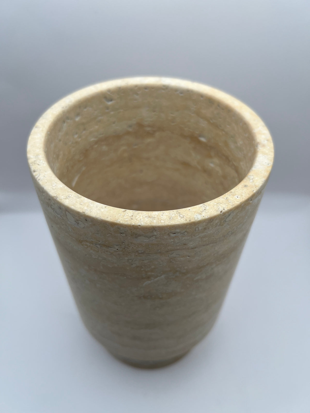 A gorgeous solid tall vase/wine chiller carved from a single block of Travertine stone.