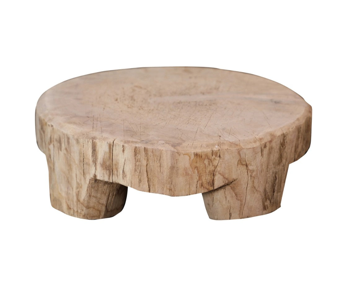 The Chapati Board is a long-standing household necessity in homes across India. These vintage Bleached Chapati Boards take a modern turn as a home accent. These round, wood slabs with small legs make a sturdy farmhouse display stand for candles or a collection of succulents. These are for display only. Size, coloration and shape vary.