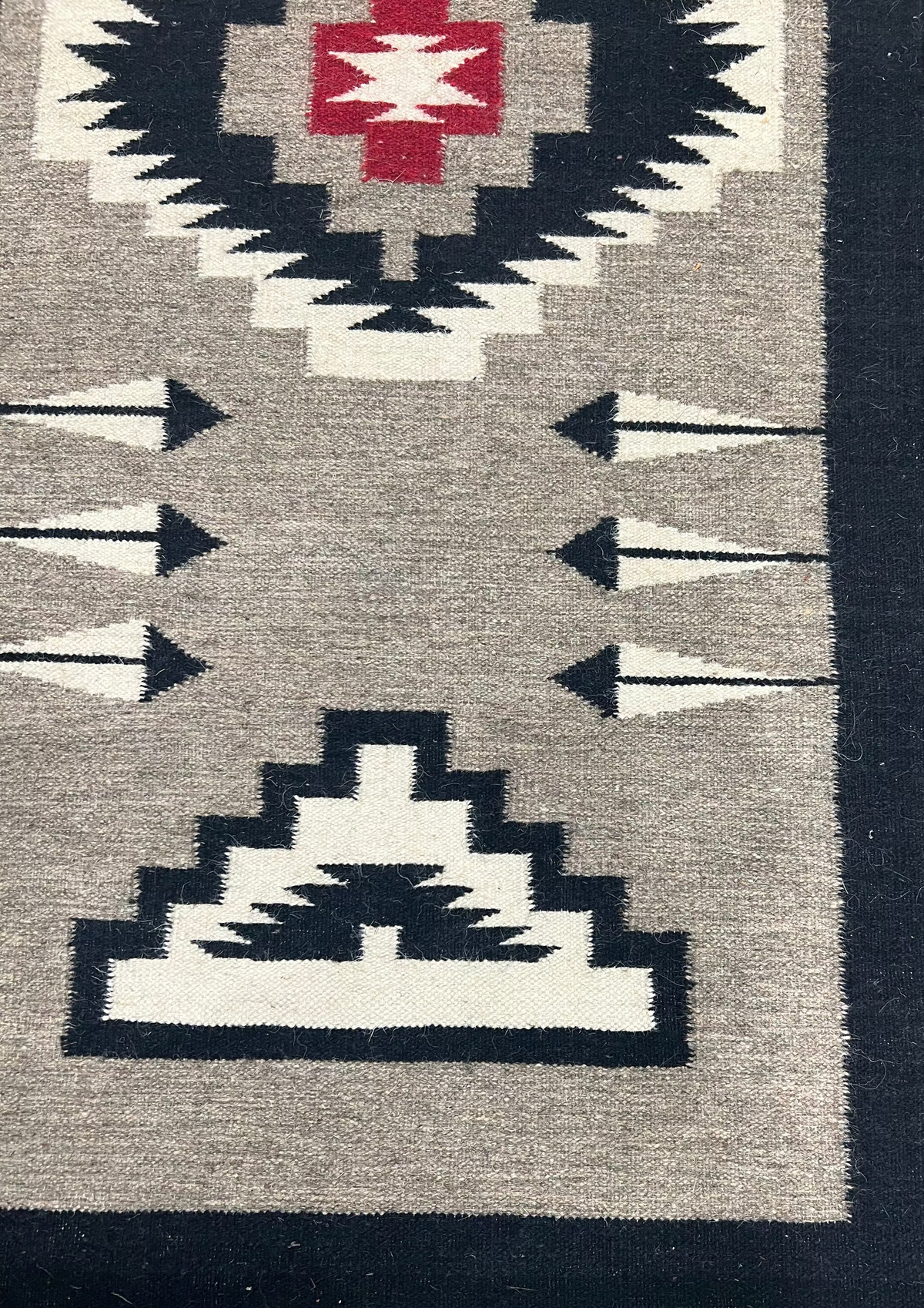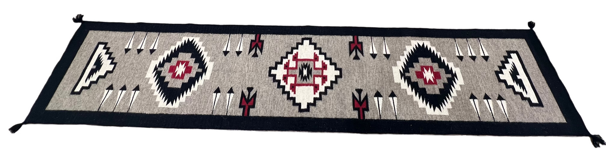 A bold geometric Tribal Wool Berber Flat Weave Runner Rug in variations of Red, Grey, White and Black colorway.