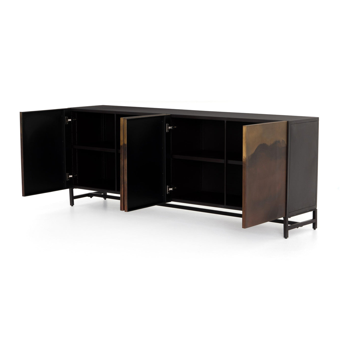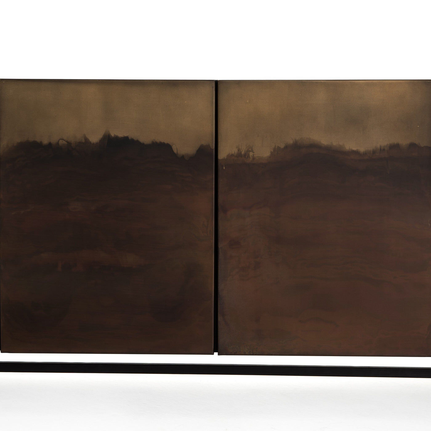 The Stormy Sideboard makes a dramatic statement with its rich, moody finish and clean-lined silhouette. Its four front panels create a one-of-a-kind abstract pattern that evokes stormy landscapes or weathered patina. A dark iron base adds industrial edge while providing sturdy support. Inside, spacious cabinetry offers versatile storage for dining essentials, media components, or clutter-prone items, making it both beautiful and functional. Perfect for those who appreciate modern design with an artisanal twist.